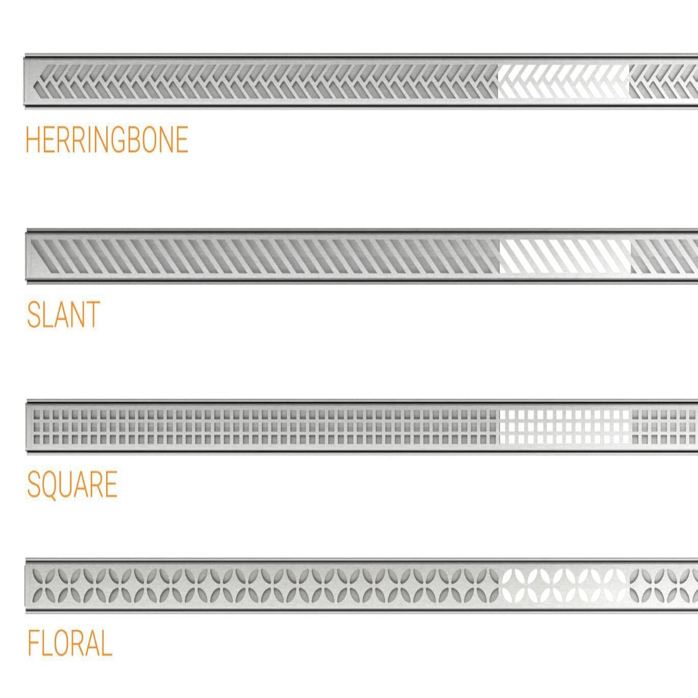 • Four grate designs available in brushed stainless steel and 9 TRENDLINE colors: HERRINGBONE, SLANT, SQUARE and FLORAL